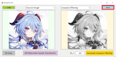 4. 在textBox輸入欲平滑的數值,按下「Gaussian Lowpass Filtering」輸出平滑圖(可在comboBox選擇灰階圖方便對比)。
